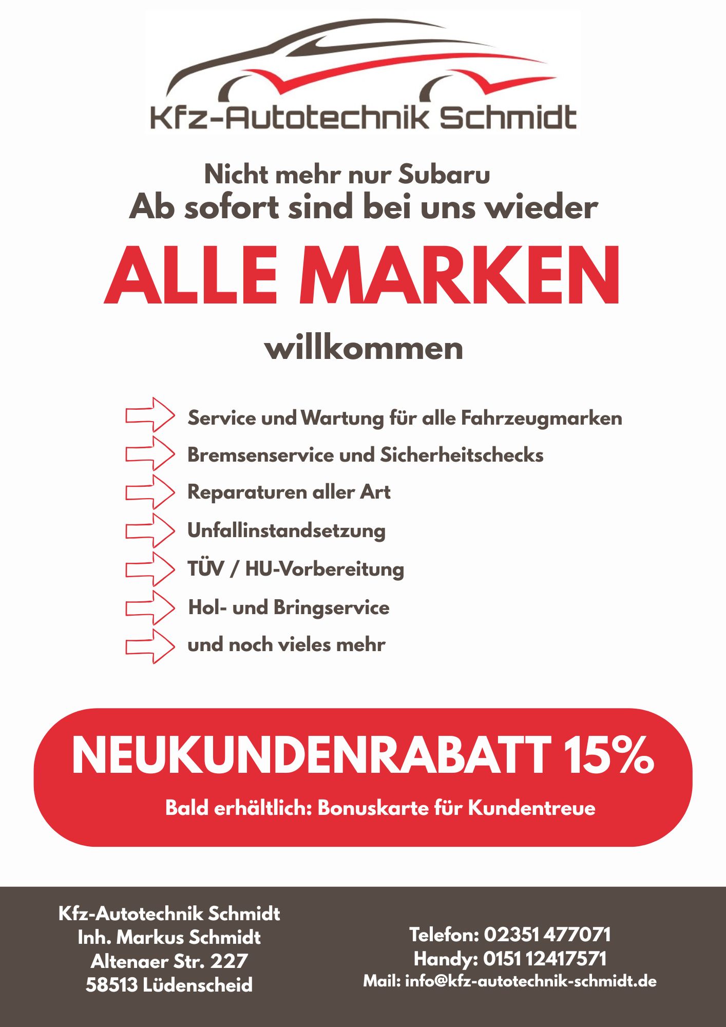 Wir sind umgezogen in die Altenaer Str. 227. Unsere Werkstatt liegt aus Lüdenscheid kommend links und ist das letzte Gebäude vor der Autobahnbrücke. Man erkennt uns durch die rot-weiße Fassade.